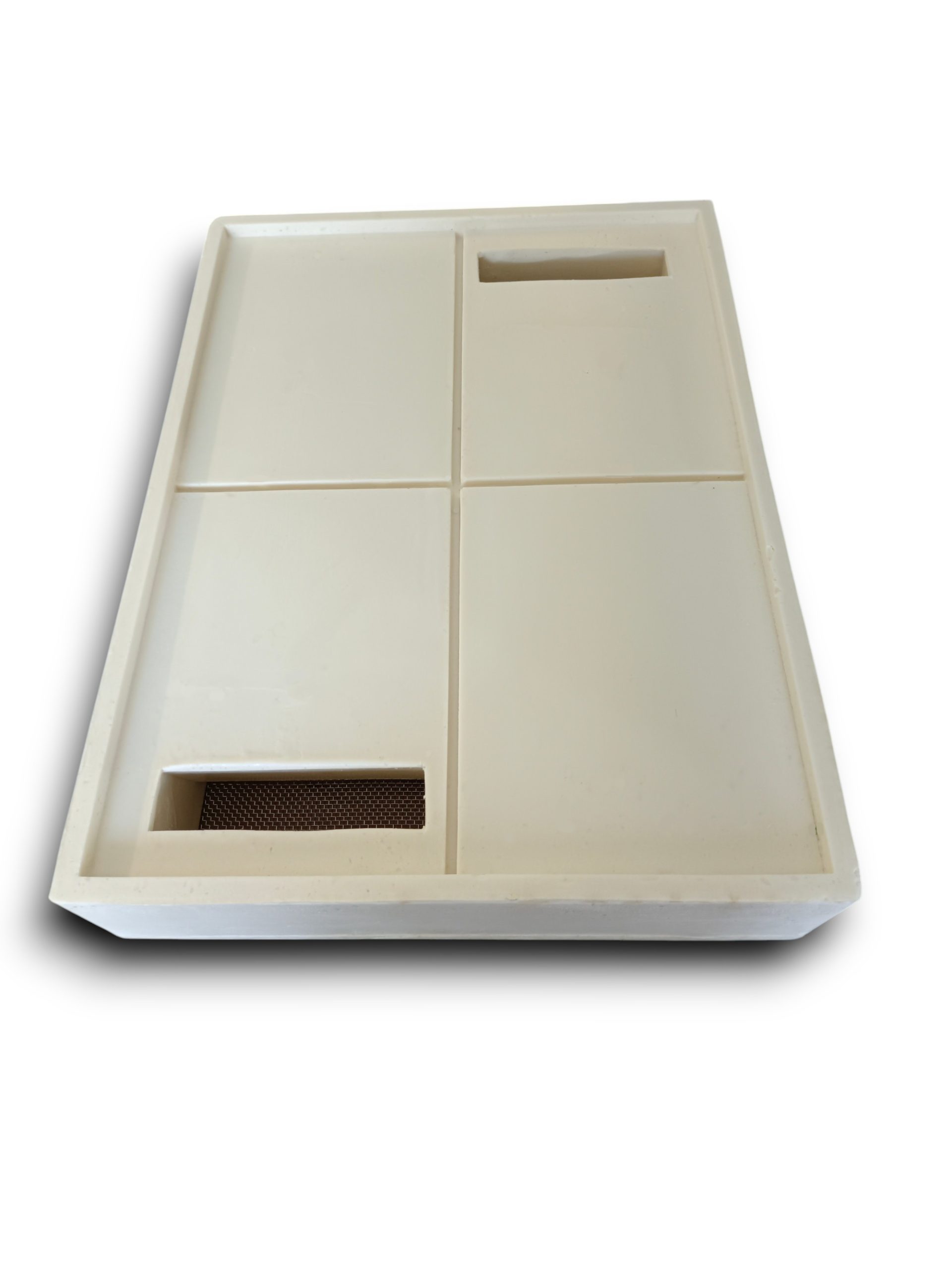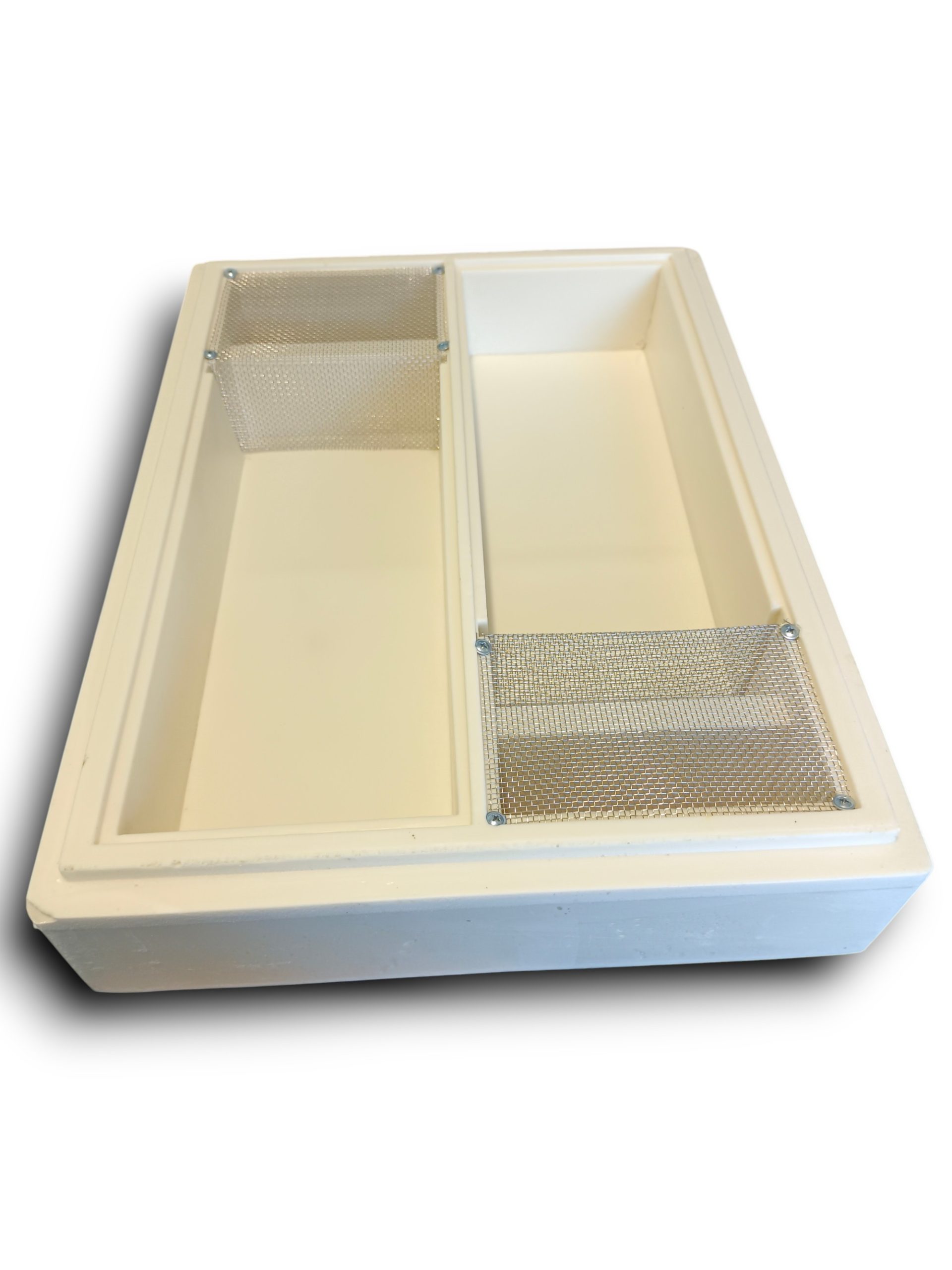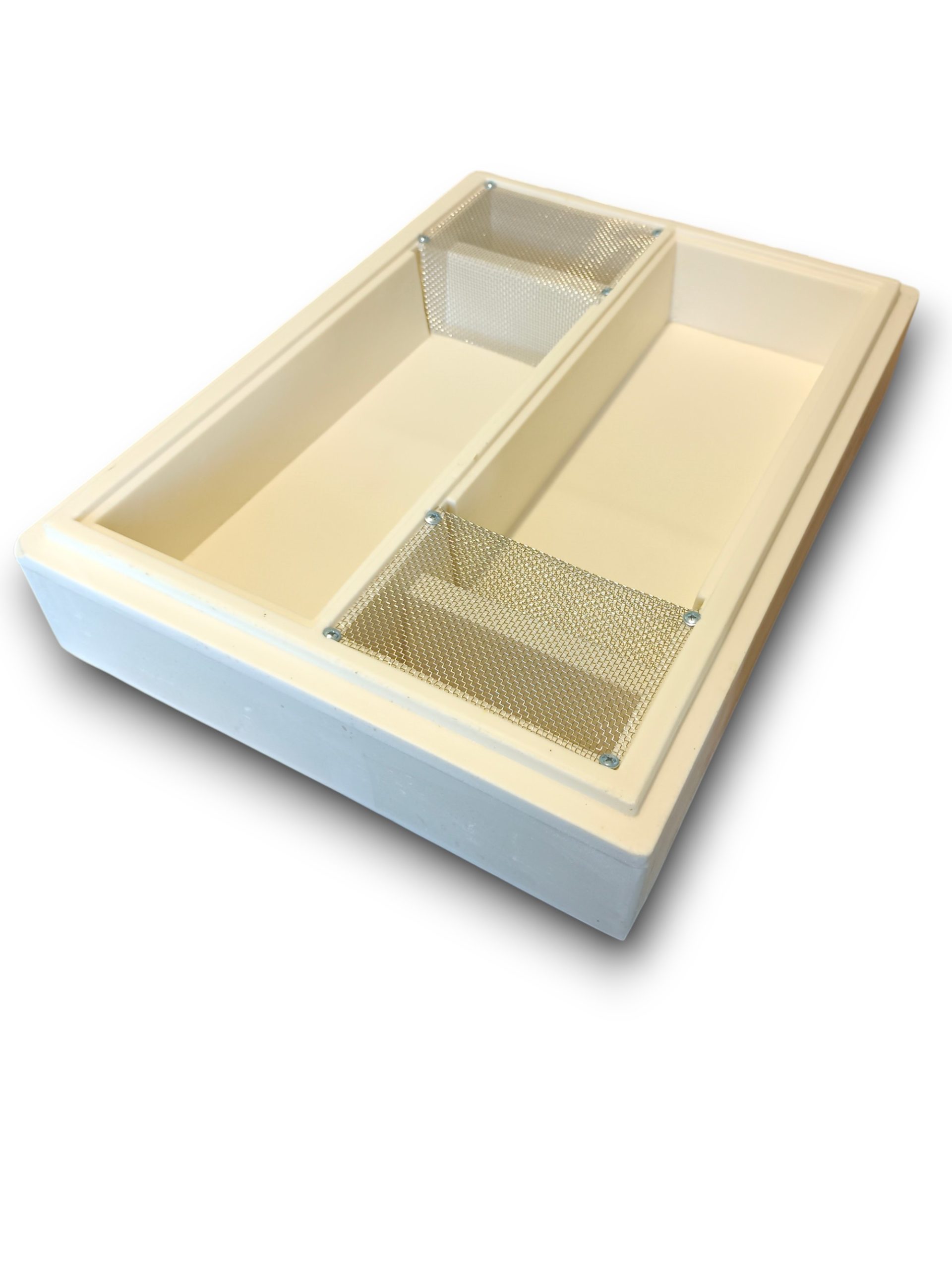 Загальний обсяг 6 літрів. Поділена навпіл для можливості кормити відводки окремо. З данною кормушкою дуже гарно зимувати, тому що вона також виступає в ролі теплої потолочини. Також вона є помічником при кочівлі. При знятій кришці, утворюється додаткова вентиляція, що обумовлює гарну кочівлю на далекі відстані. Також у кормушці передбачен ухил в сторону кормових отворів з гнізда. Саме тому підкормка завжди буде у доступі бджіл, а не по кутах вашої кормушки.
