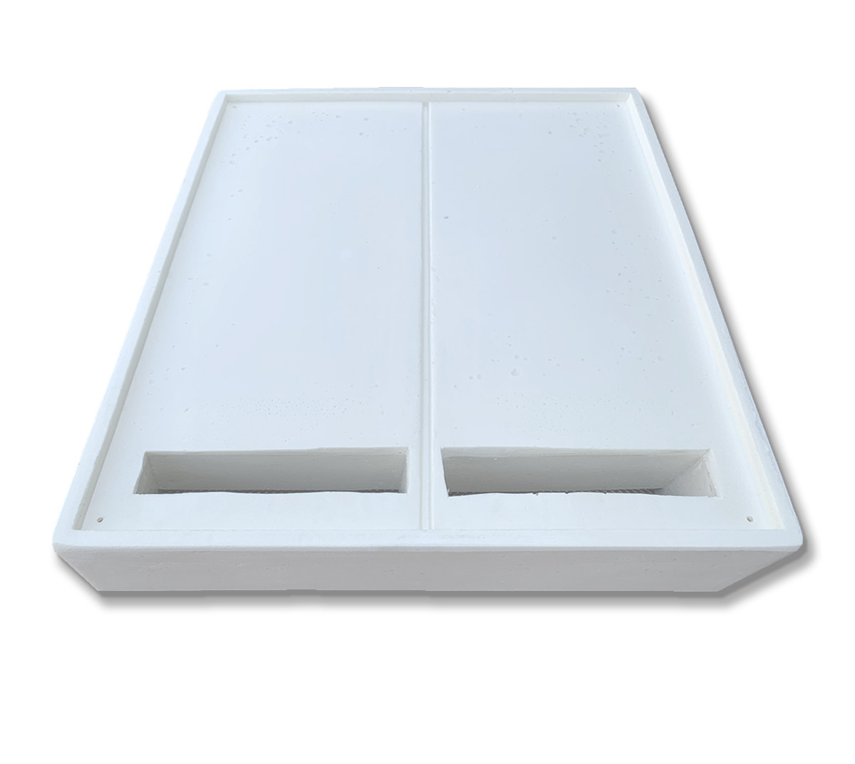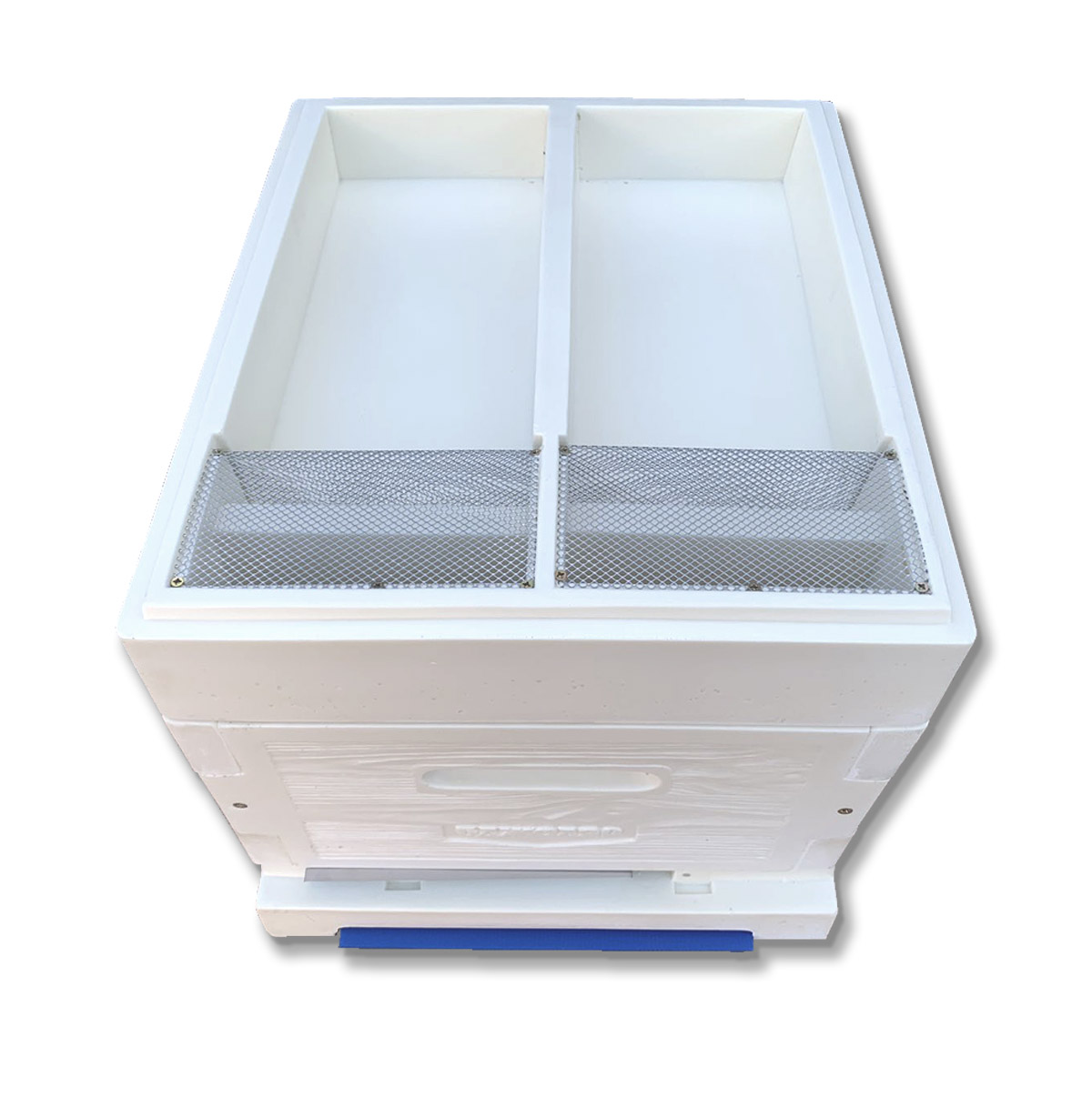 Загальний обсяг 8 літрів. Поділена навпіл для можливості кормити відводки окремо. З данною годівницею дуже гарно зимувати, тому що вона також виступає в ролі теплої потолочини. Також вона є помічником при кочівлі. При знятій кришці, утворюється додаткова вентиляція, що обумовлює гарну кочівлю на далекі відстані. Також в годівниці передбачен ухил в сторону кормових отворів з гнізда. Саме тому підкормка завжди буде у доступі бджіл, а не по кутах вашої годівниці.